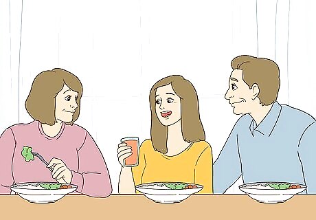 Eat meals together as a family. Between work, homework, friends, and the internet and TV, it can hard to get all members of your family together at the table for dinner, but studies have repeatedly shown that regular family meals is a proven indicator of desirable behavior in children of all ages. Make family meals a priority. Use that time to ask your child about what’s going well for them these days, and what’s upsetting them. This is a way to let them vent their frustrations in a way that actually builds up the bond between parent and child. Without regular conversations like this, you will only hear about their frustrations when they build up and explode into an argument.