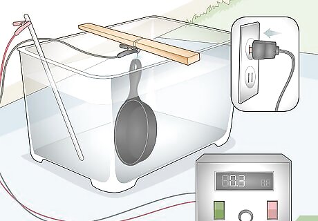 Plug in your charger and let it run for several hours. Your setup is working if the water begins to foam around the cast iron pan and your charger’s amp meter shows it operating at the upper end of its scale. Let the pan sit for 3 or 4 hours. Do not touch any part of the setup once the charger is on, to prevent electrocution.
