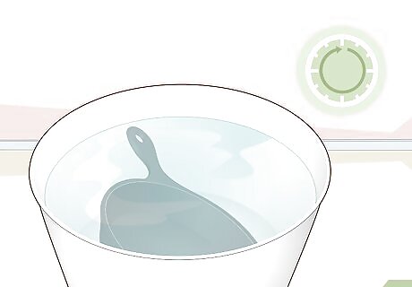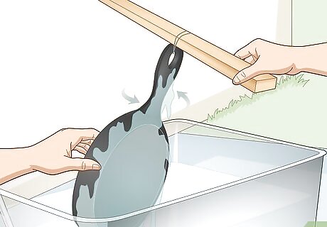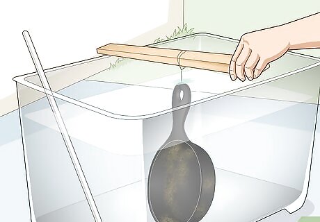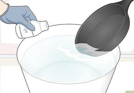Soak the pans for 24 hours in the lye solution, then scrub them. Put on heavy-duty gloves to remove the pans from the lye. Using a mildly abrasive sponge or brush, scrub the surface of the pan to remove the seasoning that's been loosened by the lye. If, after 24 hours, there is still seasoning on the cast iron, put the pans back in the bucket for a few more hours. The seasoning will appear as dark spots on the original gunmetal gray surface of the pan. Lye won’t harm the metal at all, so don’t worry about leaving it in the solution for too long. Always keep the bucket covered when you’re not using it.