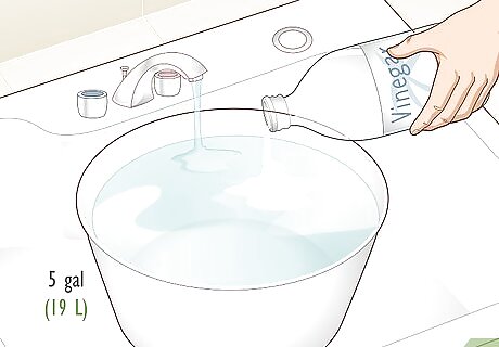 Fill a 5-gallon (19 L) bucket with equal parts white vinegar and water. After you’ve removed old seasoning from your cast iron pans, you will then need to remove rust. Buy several 1 gallon (3.8 L) jugs of cheap distilled white vinegar. Pour them into a large plastic bucket and mix with an equal amount of water. You can also plug your sink and fill it with vinegar and water, if you don’t have a bucket on hand.