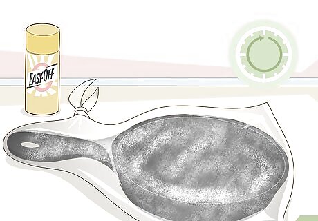 Coat your pans with Easy-Off and seal them in bags for 24 hours. To restore cast iron pans, you can strip off the original seasoning using lye. If you are restoring just one or two pans, it is probably easiest to use an oven cleaner that sprays a lye-based foam, like Easy-Off. Spray the foam all over the pans you’re restoring, seal them inside heavy-duty garbage bags, let them sit for 24 hours, then scrub with steel wool. Depending on your pan, it may take multiple applications and scrubbing sessions to remove all the seasoning.