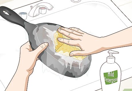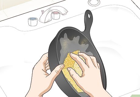 Scrub off any remaining flakes of rust with a sponge. Using a mildly abrasive sponge or gentle scrub brush, wash the cast iron pans to remove any last flecks of rust. Rinse with warm water.