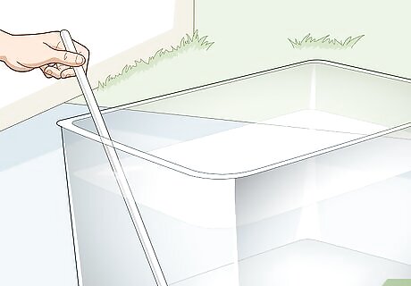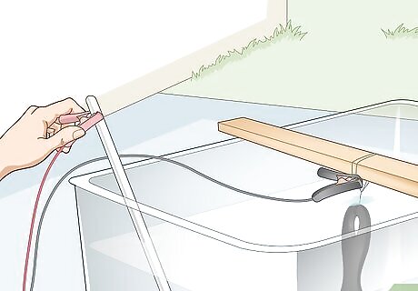 Place a piece of scrap metal into the tub. Cheap metal baking pans work well for this. Other low-cost options include rebar, used lawn mower blades, or large, flattened steel cans with the top and bottom removed. Pieces of metal with more surface area tend to be the most efficient. Make sure an inch or two of the metal sticks out of the water. Test with a magnet to ensure the object is steel, not aluminum, which won’t work. You can use as many as four pieces of metal, which will speed the process along. These will need to be connected to each other by a metal wire to allow the current to pass through all of them.