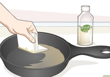 Re-season your pans. Rub the entire cast iron pan down with a neutral oil, such as vegetable oil. Then, place the cast iron in the oven at 350 °F (177 °C). Let it bake for about an hour, then allow it to cool down for at least 45 minutes before you use it. Each time you use the pan to cook, make sure you wipe it down with another layer of oil. This will build up a protective coat to guard against rust.