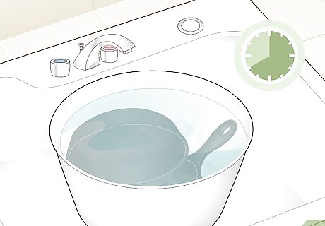 Soak the pans for up to 8 hours. Place the pans into the bucket or sink. Make sure there’s enough of the vinegar-water mixture to completely cover your pans. Don’t let the pans soak for more than 8 hours, since vinegar can erode and pit cast iron if it’s exposed for too long.