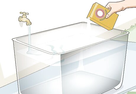 Fill a large plastic tub with water and washing soda. Make sure your tub is big enough to hold enough water to cover the pot you’re trying to clean—usually at least 8 gallons (30 L). Add washing soda, a laundry booster which is different than baking soda, to the water. Use roughly 1 tablespoon (15 mL) of laundry booster per gallon of water. Do this outside or in a vented garage, since it produces hydrogen gas that is potentially flammable. Too much washing soda can result in excessive current and issues with overheating.