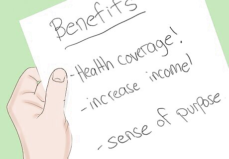Identify the potential benefits to returning to work. Returning to work has many potential benefits. If you're considering going back to work, it may be worth looking further into how a regular work schedule could benefit you. If you retire before age 65, you will not yet qualify for Medicare. By returning to work until you're at least 65, you'll be able to get health coverage through your employer, or at least be able to pay for healthcare more easily. By returning to work, you can increase your monthly income to help pay for any expenses and build a savings for the future. Returning to work will also allow you to spend more time out of the house. This can generally help you have a normal schedule and a sense of purpose, which some individuals lose after retiring.