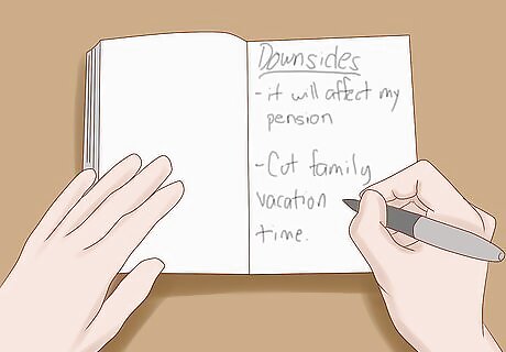 Recognize the potential downsides of returning to work. Working after retirement can be enjoyable and highly rewarding. However, there are also certain downsides that can come with returning to work after retirement, and the risks need to be weighed against the benefits. Returning to work could negatively affect your pension, which is calculated based on your salary in the years prior to retirement. If you resume working and then permanently retire later, it could result in a lower pension payout. Going back to work can potentially cut into your family and vacation time. As a new employee, you may be expected to pick up swing shifts, holidays, and other undesirable work blocks.