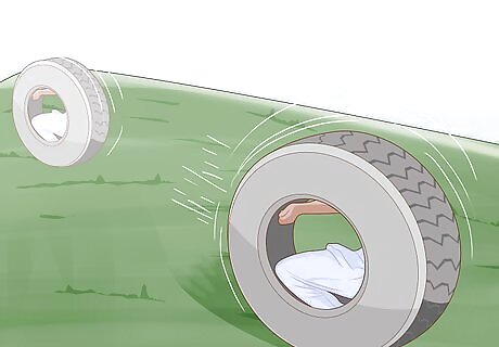 Tuck yourself into a giant tire. If you can find a tractor tire, try using it to roll down the hill. Sit inside the tire while it’s balanced on its side, making sure your legs and arms are safely inside. You might need a friend to help you get the tire started rolling. Rolling in a tire can be more dangerous than rolling on your own, so be sure to keep all of your limbs tucked in, and make sure it's a very gentle slope with no holes or bumps.