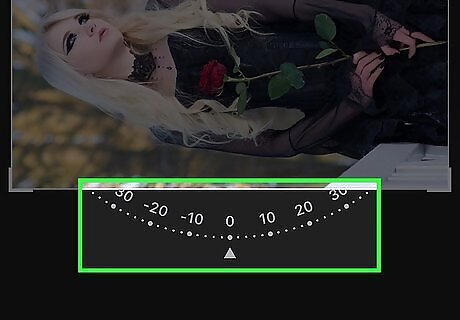 Tap and drag the dial beneath your photo left or right. Doing this will slowly rotate your photo a couple of degrees at a time. This option will also zoom in and resize your photo as you rotate it.