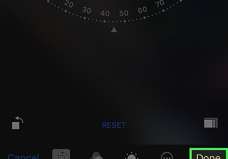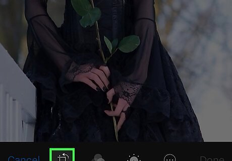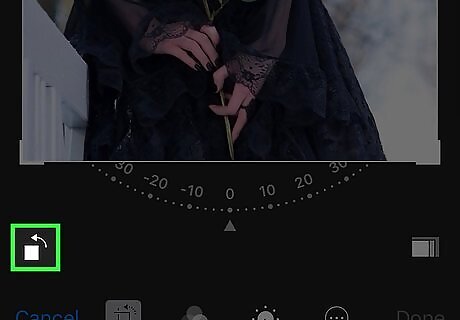 Tap the box with an arrow over it. It's above Cancel on the left side of the screen. Doing so will rotate your photo 90 degrees. Each time you tap this box, the photo will rotate by 90 degrees.