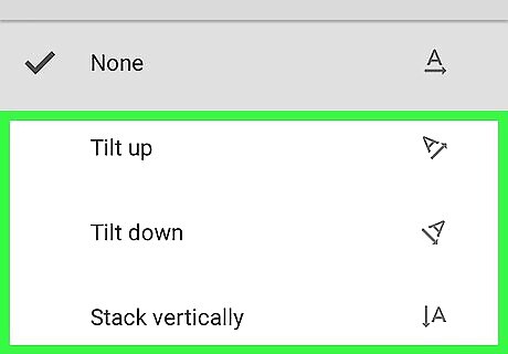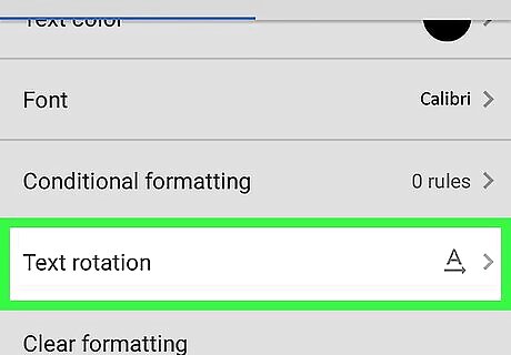 Select an angle or rotation. Tap any option in the menu to see a preview on the spreadsheet. If none of the rotation options are what you desire, scroll to the bottom of the menu and tap Custom angle. Enter a custom angle (in degrees) and tap OK to apply.