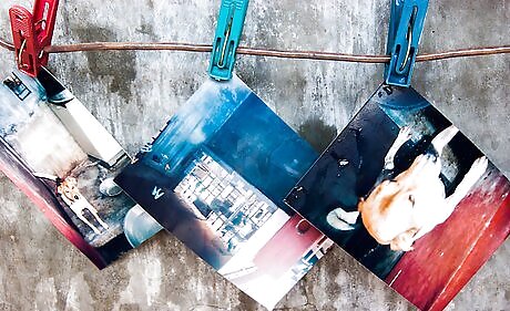 Gently dry the photos. The first thing to do after getting them out of the album is to dry them. The preferred method is to hang them on a line - this allows gravity to work on them best. The water runs down on the page (hang them from a corner, one clip only) toward the point, and keeps the paper from warping as the water's weight allows the top part to dry first, keeping downward pressure on the drying paper. If you can't hang them, they will dry fine on an absorbent material such as a kitchen or paper towel, although they may be more prone to buckling here and there (harmless). Do not blot as it could damage the surface.