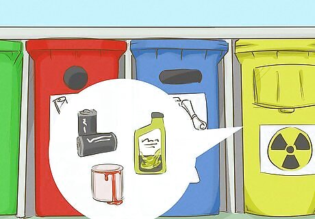 Dispose of your household cleaning products responsibly. Never pour any cleaning products down a drain unless the product is specifically formulated for that purpose. Chemicals from cleaning products are rarely removed from the water and can be pumped directly into a wetland. Try to buy cleaning products that are non-toxic, and come in bulk packages. Pour liquid or gel cleaning products that mix with water down the drain while running water, since they’re water soluble. Place any solids, like scouring pads or wipes, into the trash. For other cleaning supplies, like furniture polish or oven cleaner, call your local government to see if they have a program for collecting and disposing hazardous waste or toxic products.