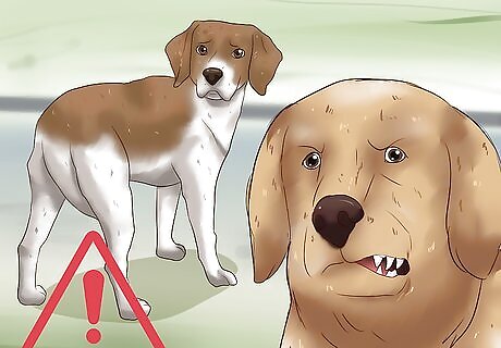 Look for signs of submissive or nervous behavior. Some dogs will present their stomach out of fear or submission. These dogs do not actually want their stomachs rubbed and you should avoid doing so. Look for some of the following signs of submission and fear in your dog and avoid rubbing its stomach if they are present. Dogs who are afraid will often tuck its tail in between its legs. Nervous dogs will take on a hunched and tense posture. Avoiding eye contact is usually also a sign that the dog isn't really that comfortable. Fearful dogs will likely not move much after they present their stomach. Submissive and fearful dogs may growl at you if you approach them. If your dog is covering its belly with their paws, it's probably not a good idea to pet it.