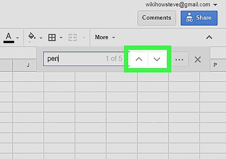 Press the Android 7 Expand Less and Android 7 Expand More icons to see the next match. These buttons are located next to the search field in the upper-right corner. They will help you jump to the next matching cell. Alternatively, you can press ↵ Enter or ⏎ Return on your keyboard. They function the same as the Android 7 Expand More button.