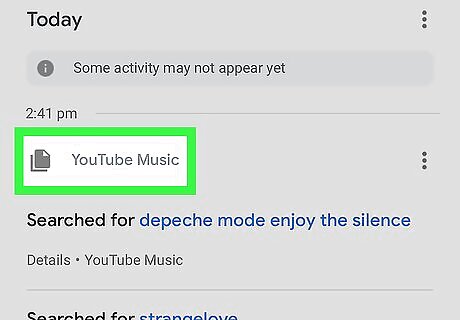 Scroll down and find the YouTube Music heading. You can see all your Google, YouTube, and YouTube Music search histories here. You can also use the search bar at the top if you're looking for a specific search in your history.