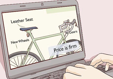 Compose an advert that highlights your bike’s model, condition, and features. In the headline for your ad, include your bike’s model, condition, and type. In the body, describe your bike’s specific features, like a leather seat, new wheels, and how many gears it has. Use accurate language and avoid hyperbole to convey information about your bike in a way that will help readers understand what you’re selling.Tip: Take some photos of your bike with a high-quality camera and adequate lighting to make it appealing to potential buyers. If you don’t want to negotiate, write “price is firm” at the end of your post. If your bike is in a poor condition, list it as “heavily used.” Your bike’s type is either a fixed gear, mountain, folding, electric, or racing. If it has pegs, it will be considered a BMX bike.