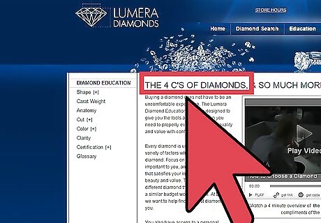 Know how diamonds are evaluated. There are many factors that go into valuing a diamond. These factors are known as the Four C’s. Clarity refers to how clear a diamond is. Diamonds with no flaws are more valuable. Cut refers to the diamond's shape and proportions, and it's graded according to how well it fits the ideal shape for the cut. The cut, along with the other factors, impacts the value of the diamond. Color can drastically influence the price of a diamond. Some colored diamonds (pink, blue, yellow) are highly valued but a white diamond with a yellow tint will be less valuable than one that is colorless. Carat refers to the size of the diamond. Larger diamonds, especially those over 1 carat, are more expensive.