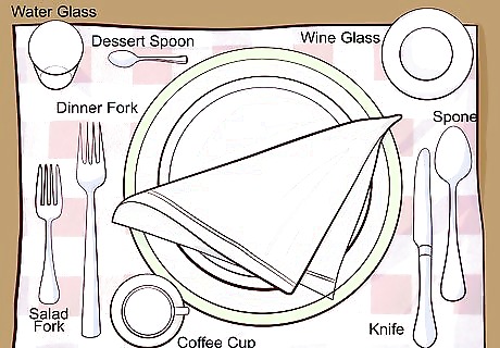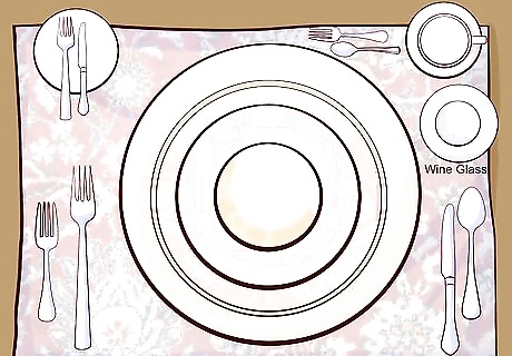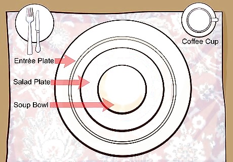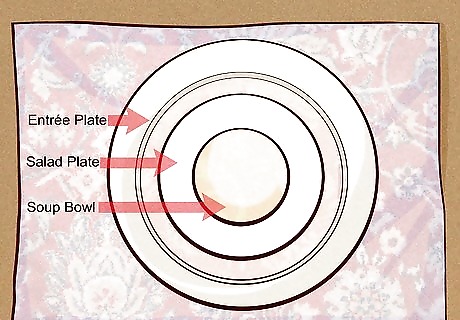 Arrange your plates on the charger plate. Always arrange the plates in order of use. For example, if you were serving a soup, salad, and entrée, you would first place the main entrée plate on the charger. Next, you lay down a salad plate, followed by a soup bowl. Each piece of plates will be cleared away after use. If you’re serving more than three courses, have each plate brought out and then cleared away after the course to save space. Wait to clear the charger plate until it’s time to clear the entrée plate.