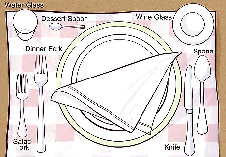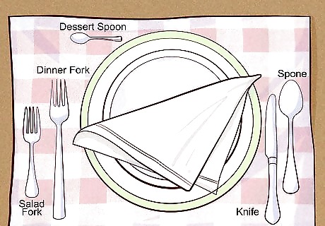Place your silverware on the placemat. The forks will be placed on the left side of the plate and the knife and spoon on the right. Place the salad fork (if needed) to the left of the dinner fork and place the spoon to the right of the knife. If you want to set out dessert utensils, place them above the plate. The sharp side of the knife should be turned towards the plate. Only set the table with silverware that you will use during the meal.