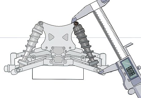 Use a ruler or calipers to measure the length of each shock. Measure from the center of the screw at the top of the shock to the center of the screw at the bottom of the shock. Read the distance in millimeters to get your droop. The shocks are the sets of springs and pistons attached to the wheels at the front and back of your RC car. The droop can be different for the front and back shocks, but it should always be the same from side to side. In other words, the 2 front shocks should have the same droop as each other and the 2 back shocks should as well. If your RC car has a back wing that is attached separately from the body, you might have to take it off to more easily measure the rear droop.