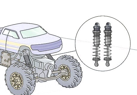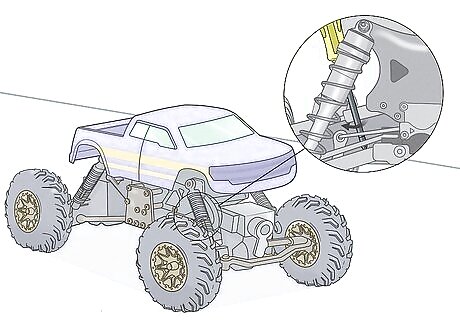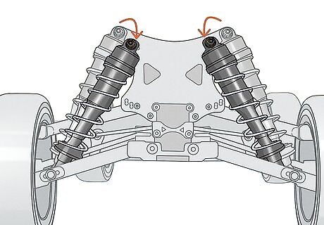 Move the shocks on the shock towers to set droop if they are adjustable. Look on your RC car’s shock towers to see if there are multiple holes that you can position the shocks in. Reposition the shocks in a hole higher up on the shock towers to decrease droop or lower down on the shocks to increase droop. The shock towers are the T-shaped plates at the front and back of an RC buggy’s chassis that the tops of the shocks hook onto.