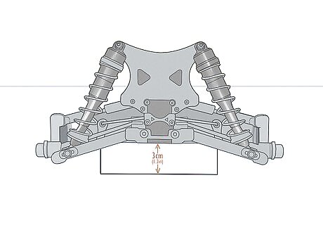 Place your RC car up on blocks that are at least 3 cm (1.2 in) tall. Set up a pair of droop gauge support blocks, an RC car stand, or a pair of wooden blocks on a flat table, desk, or another work surface. Put the underside of your RC car’s chassis up on the blocks or stand so that the shocks droop down freely without touching the surface. Droop gauge support blocks are a special set of blocks used for setting droop. You can purchase them online or wherever you buy your RC supplies. If you’re using blocks, set 1 block under the front suspension and 1 block under the rear suspension. If you’re using makeshift blocks, such as 2 pieces of wood, make sure that they don’t limit the downward movement of the suspension. You can do this by placing them closer to the middle of the chassis, out of the way of the axles, or by using blocks that are not wider than the chassis.