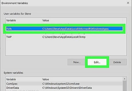 Select the "Path" variable and click Edit. Choose the one that's under "System Variables" at the bottom of the window, not the one under "User Variables". If there is no Path variable under "System Variables," click New below that section, then type Path into the "Variable Name" field.