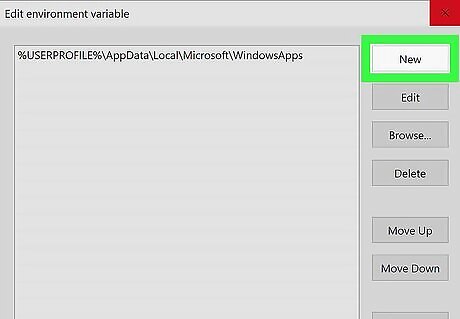 Add the path variable. If you clicked Edit in the last step, click New near the top-right corner of the window, and then enter the desired path. If you had to create a path variable, in the last step by clicking New, type the desired path into the "Variable Value" field.