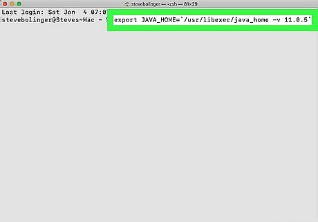 Run the export command to set your path. If you only want to set the path for the current terminal window, use step. If you want to make the change permanent, skip to the next step. Here's how set the path for the current terminal only: Note the version number you want to use as your default installation (e.g., 1.8.0_121). Type export JAVA_HOME=`/usr/libexec/java_home -v version_number`, replacing version_number with the actual version (e.g., 1.8.0_121). Press ⏎ Return.