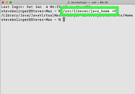 Find the locations of your Java installations. You usually won't need to add or update the path unless you are switching between installed Java versions. To see which versions are installed (and their locations), type /usr/libexec/java_home –V and press ⏎ Return.