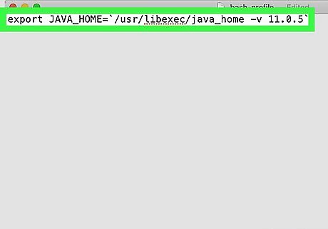 Add the export command to your shell profile. If you want to update the path permanently so you don't have to run export every time you open a terminal window, follow these steps: Type $ cd ~/ and press ⏎ Return. This ensures you're in your user directory. Type ls -a and press ⏎ Return to see the contents of your user directory. If you see a file called .bash_profile, great! If not, type touch .bash_profile and press ⏎ Return to create it. If you use a different shell, ignore this step. Type open -e .bash_profile and press ⏎ Return to open the file in your default text editor. If you use a shell other than bash, open your shell's profile in your desired text editor as you wish. Type export JAVA_HOME=`/usr/libexec/java_home -v version_number` on the first empty line in the file. Replace version_number with the version you want to set as the default (e.g., 1.8.0_121). Save the file and close the text editor. If you skipped step 3, type source .bash and press ⏎ Return so the path is set for the current window.