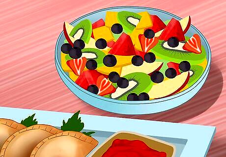 Prepare side dishes. You can have summer themed dishes at your garden party. Have potato salad, watermelon, fruit salad, or cucumber salad. Consider having finger food. It is nice for guests to have easily portable food so they can wander around and mingle while they eat. Good finger food options are cheese plates, mini empanadas, and cucumber stacks.