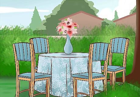 Set up tables and chairs. Have tables and chairs set up in your space before the party. You can bring out any tables and chairs you have inside or use outdoor patio furniture. If you don’t have enough tables and chairs, you can rent them from party or event stores. Set up enough chairs for all of your guests. Alternatively you can lay out blankets and pillows and make your garden party picnic style.