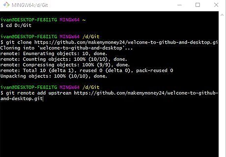 Clone the fork. In GitHub, navigate to your fork and under the repository name, click Clone or download, and copy the link it gives you. Next, in Git Bash, enter in the following command using your copied URL: $ git clone https://github.com/YOUR-USERNAME/REPOSITORY_NAME. Press ↵ Enter, and your local clone will be created.