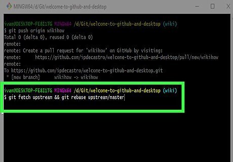 Sync your fork with the original. You need to be able to propose changes to the original repository. Navigate to the original repository that you forked in GitHub, then hit Clone or download and copy the URL. Now navigate into the actual repository folder in GitHub. You’ll know you’re in the right spot when you see a (master) to the right of your command prompt. Now simply run $ git remote add upstream https://github.com/user/repositoryName using the original URL of the repository.