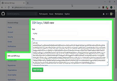 Add your SSH key to your account. You will now need to configure your account to use your newly created key. Copy the ssh key to your clipboard: clip < ~/.ssh/id_rsa.pub. Then, in the top right corner of any GitHub page, click on your profile photo, and then click Settings. In the user settings sidebar, click SSH and GPG keys. Then click New SSH Key. Now you can enter in a descriptive name for your key then paste your key into the key field, and press "Add SSH Key". Confirm it, and you’re all set!