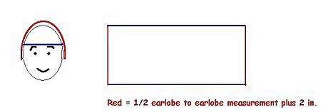 Measure the head that the hat will fit. You will need the circumference (distance around) and the distance from one earlobe to the other, going over the crown of the head. Add two inches to the earlobe/crown measurements. Add one inch to the circumference measurement.Measuring_575.JPG