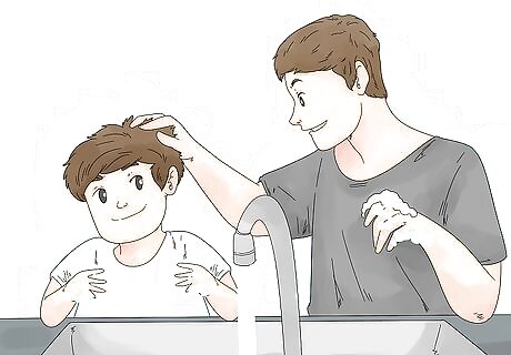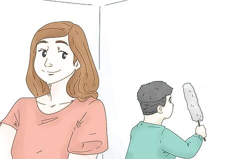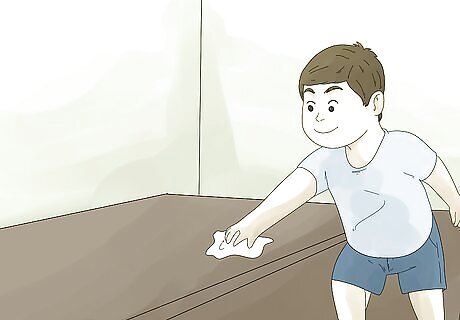 Have children aged 5-10 help organize and clean the house. Kids between 5 and 10 years old can pick up after themselves, clean their rooms, make their beds and do more general household tasks such as washing dishes, dusting and wiping down surfaces, and setting the table. Have them lend a hand with cleaning up and helping to organize for more complex tasks. For instance, they could gather the clothes hampers and place them near the washing machines to help out with laundry. Be patient with kids that are struggling to finish their tasks. Take a moment to show them the correct way to do something if they’re having trouble.
