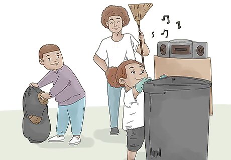 Break up larger tasks into smaller pieces multiple people can do. Everyone can do their part when it comes to big, complicated tasks such as cleaning out a garage or attic. Instead of giving the job to 1 person, bust it up into bite-sized pieces so everyone can chip in and make the task easier. For instance, if you’re looking to clear out the basement, have adults and older teenagers lift and move heavy objects, and do complicated tasks like mopping. Younger kids can sweep and pick up smaller items. Try to distribute the pieces of a larger task as evenly as you can.