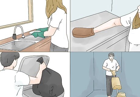 Split chores evenly between adults in your home. Tasks that are more complex or require you to take safety precautions, such as retrieving packages, taking out the trash, or disinfecting items that were outside of the home need to be evenly divvied up between adults. That way, everyone is doing their fair share, and nobody feels overwhelmed by the tasks they’re given. For example, if you’re in charge of taking care of the laundry, another adult can be responsible for keeping the dishes clean. Assign tasks based on people’s talents or interests. For instance, if you’re husband is a great cook, maybe you can handle cleaning up the dishes afterward.