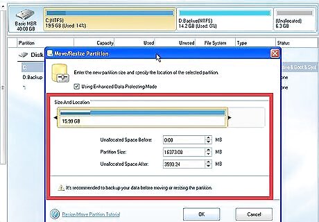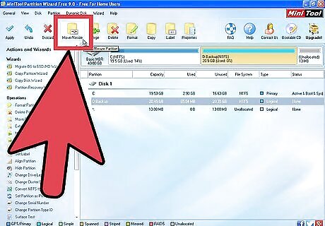 Queue up any additional changes. Partition Wizard allows you to queue up multiple changes to be applied at once. You can use this function to perform several tasks at once. The first shrink procedure in our example left unallocated space between the C: and D: drives. Select the C: drive, click "Move/Resize", and then use the slider to add the additional space on the right side of the C: partition. You now have two tasks queued up.