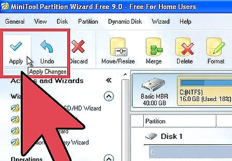 Click "Apply" at the top of the Partition Wizard window when you are finished making changes. Partition Wizard will warn you to close any open programs and to backup your data. Partition Wizard will be able to perform the action immediately if the partition being adjusted in not in use. The shrink process shouldn't take more than a few seconds, but older computers or large partitions may take longer. If a partition that you are adjusting is in use, such as your Windows partition, you will be given a couple of different options. Select "Restart Now" to restart your computer and perform the task. Partition Wizard will boot into a special interface and automatically finish the task. Windows will then continue to boot normally.