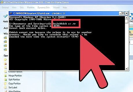 Partition Wizard will not allow me to shrink the partition. This could be caused by errors in the hard disk. Running the "chkdsk" command will attempt to repair your disk so that you can shrink the partition. Click Start and select "Command Prompt". Type {{chkdsk c: /r}} and press ↵ Enter. Replace c: with the drive letter that you need to scan. Wait for chkdsk to complete. You may be prompted to reboot so that chkdsk can perform fixes.