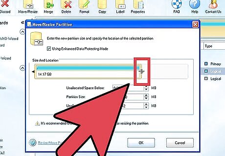 Click the "Move/Resize Partition" in the left menu. This will open a new window with a bar representing the partition's storage. Any data currently on the partition will be represented by a slightly darker color.