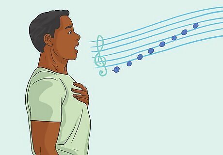 Work on your singing technique. Improve your posture, breathe correctly with your diaphragm, and use the appropriate throat technique. Having the right technique can make a significant difference in how you sound. Always do a proper warm-up before singing. It will help your voice to sound its best and will prevent potential injuries. An easy fix to performance anxiety while singing is to slow your breathing down. Getting embarrassed can cause your breathing to become rapid and shallow, which can affect your voice. Improve your voice without lessons by working on scales. The melodic start of "Do Re Mi" is familiar to us all, and helps train ears to hear correct sounds regardless of the key.