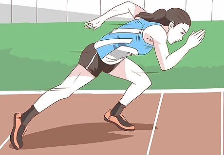 Expend yourself fully. Some studies have indicated minimal physiological difference between aerobic and anaerobic exercise. Try pushing yourself as hard as you can in short bursts. Training anaerobically literally means you’re training without oxygen, so you won't be able to do the exercises for extended periods. Figure a way to periodically go as hard as possible. Try to aim for 85% of your max heart rate, or higher, to go anaerobic. Sprint like your life depends on it. You won’t make it far, but build in a few rest periods and it will wear you out enough to produce the desired physical and sleep-related results. Jump up and down with weights. Start with small dumbbells at first, and either increase the weight or the height of the jump as you become accustomed to the difficulty. People who engaged in regular anaerobic activity lost fat more quickly, and secreted more growth hormones, which helps you to repair your body's systems, heal more quickly, and rest more soundly. You may also wish to try high-intensity interval training in which you alternate periods of low-intensity exercise (like walking) with bursts of high-intensity exercise (like sprinting).