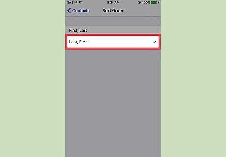 Select Last, First. Your contacts will rearrange to reflect their last names in alphabetical order. If there's already a checkmark next to Last, First, your contacts are already being sorted by their last names.
