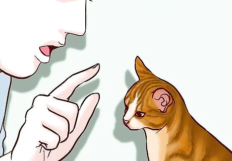 Speak in a firm voice when correcting the cat’s behavior. Use an authoritative, louder voice (but don't shout!) when the cat does something that isn’t allowed. Say “No!” or “Down!” to alert your cat that you’re displeased with a negative tone. In general, try to use the same words when you’re disciplining the cat. Using too many or too long words can be confusing.